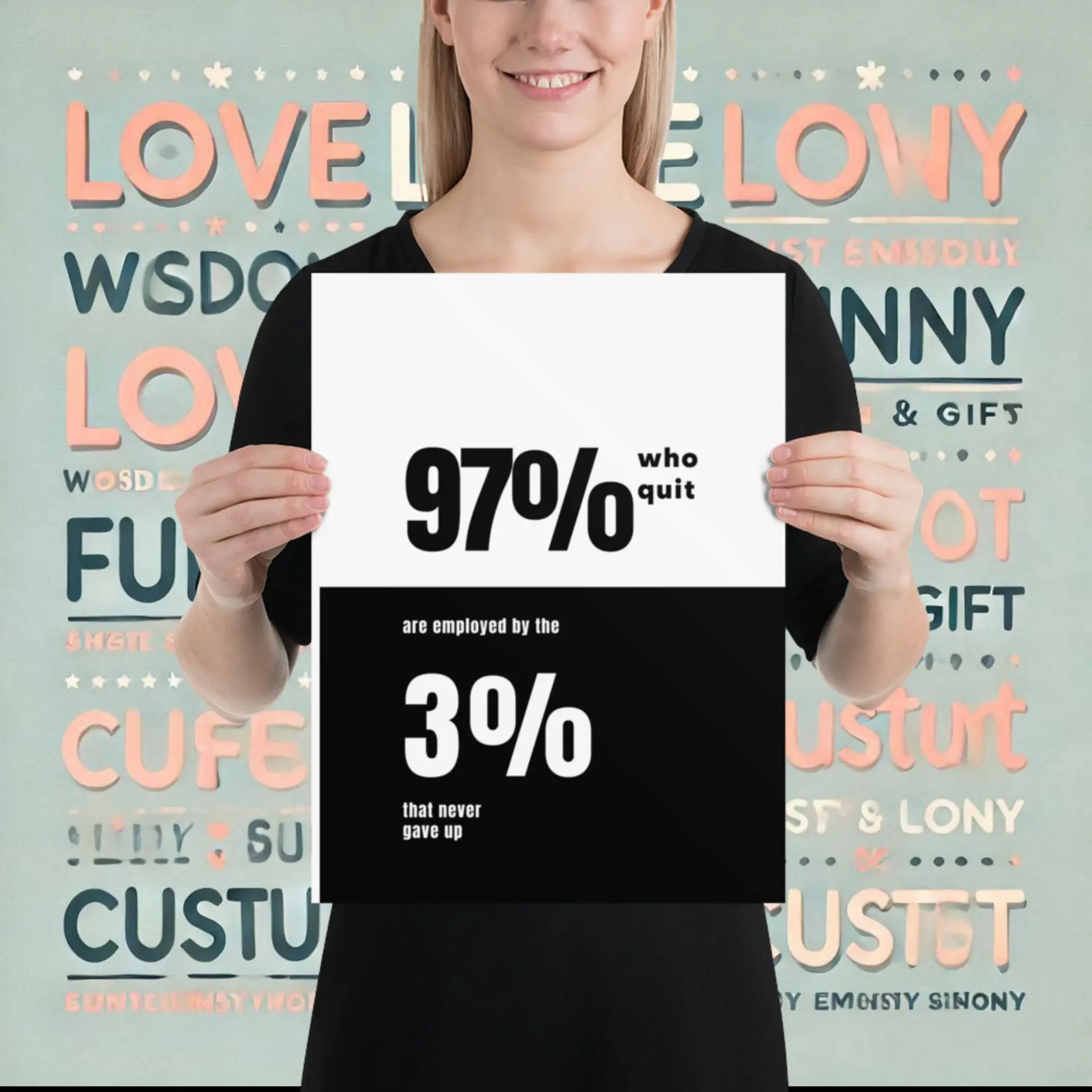 The motivational quote wall poster (cm) “97% Who Quit” pushes you to stay on track. The clean black text stands bold against white space. Use this print in your home gym, workspace, or anywhere you need extra drive.