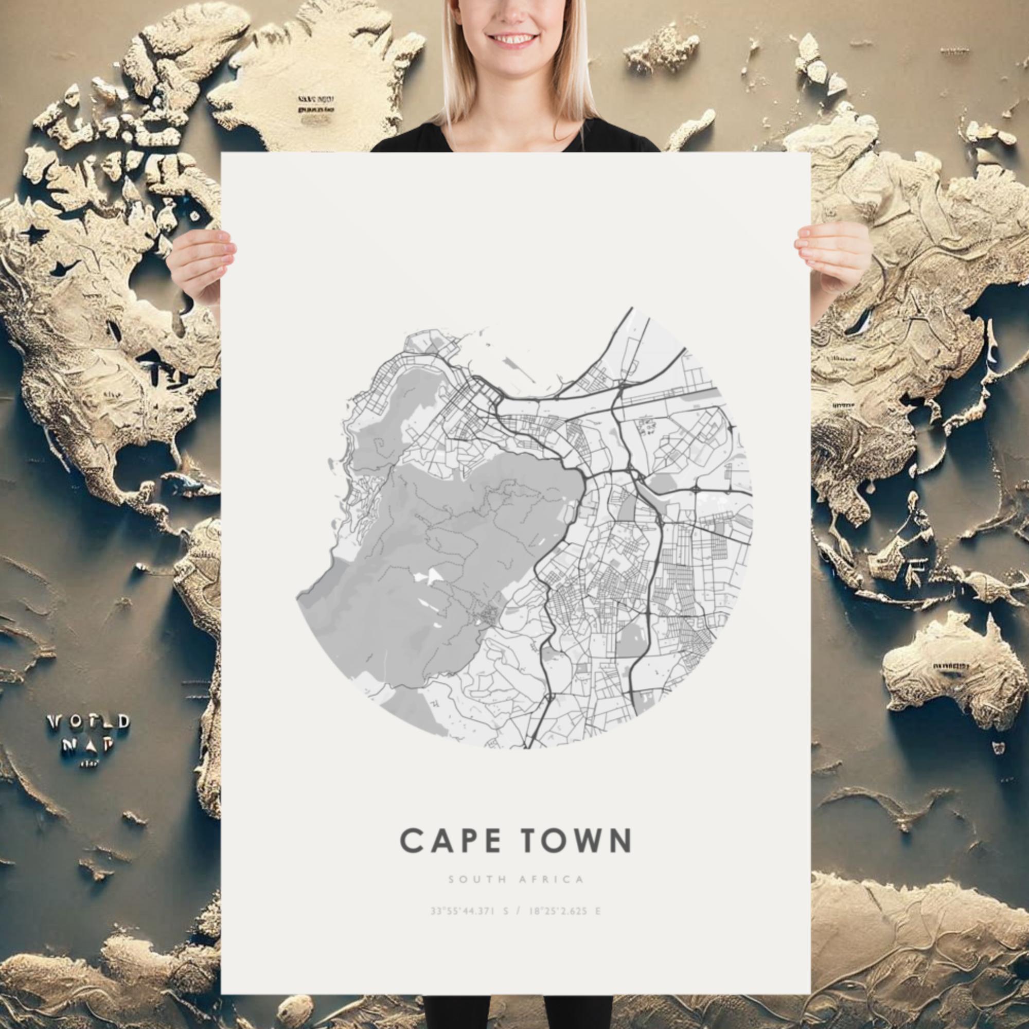 Celebrate the natural beauty and vibrant energy of Cape Town with this elegant citymap poster. Nestled between mountains and sea, Cape Town’s unique layout is captured in a clean, circular street map design that brings both sophistication and soul to your space.