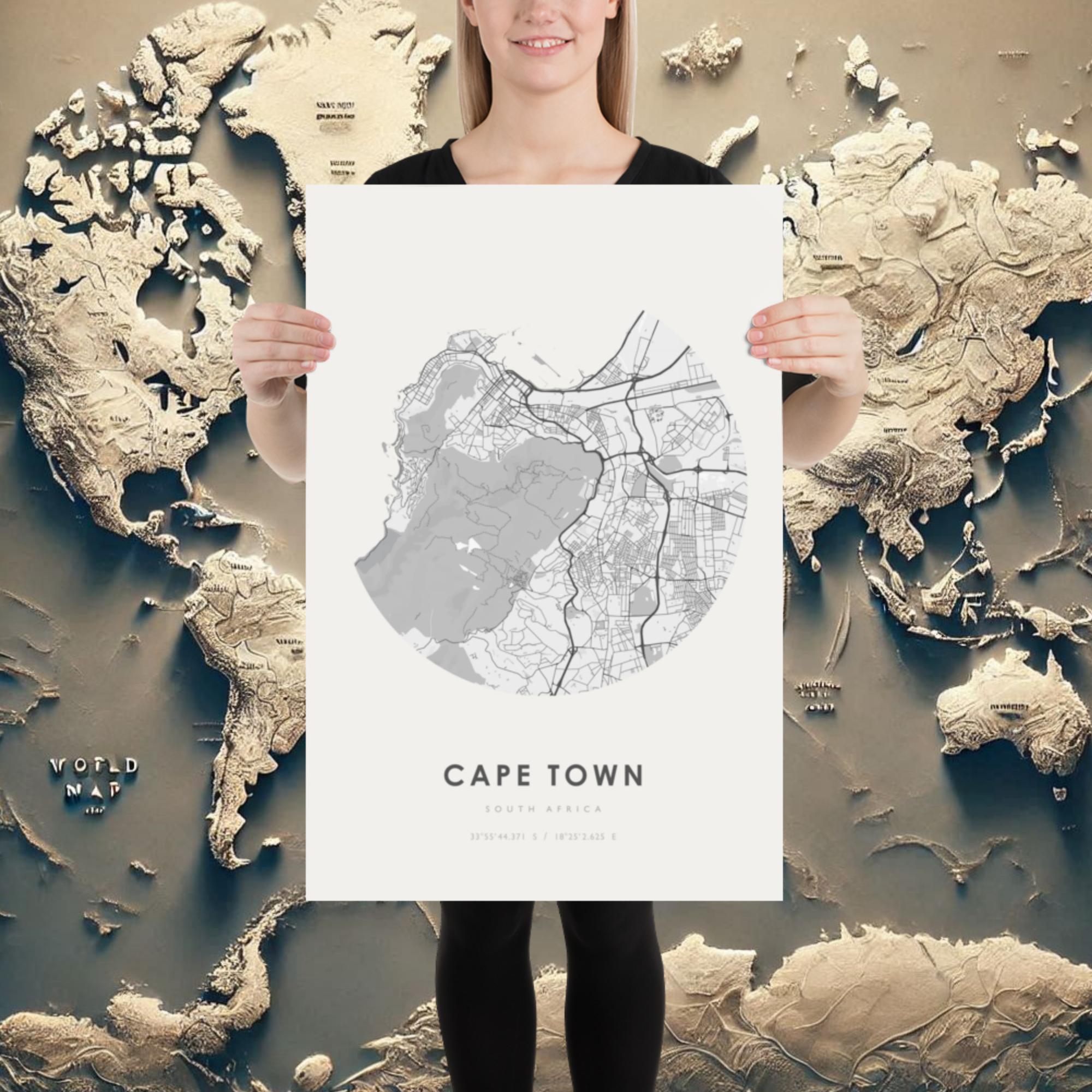 Celebrate the natural beauty and vibrant energy of Cape Town with this elegant citymap poster. Nestled between mountains and sea, Cape Town’s unique layout is captured in a clean, circular street map design that brings both sophistication and soul to your space.