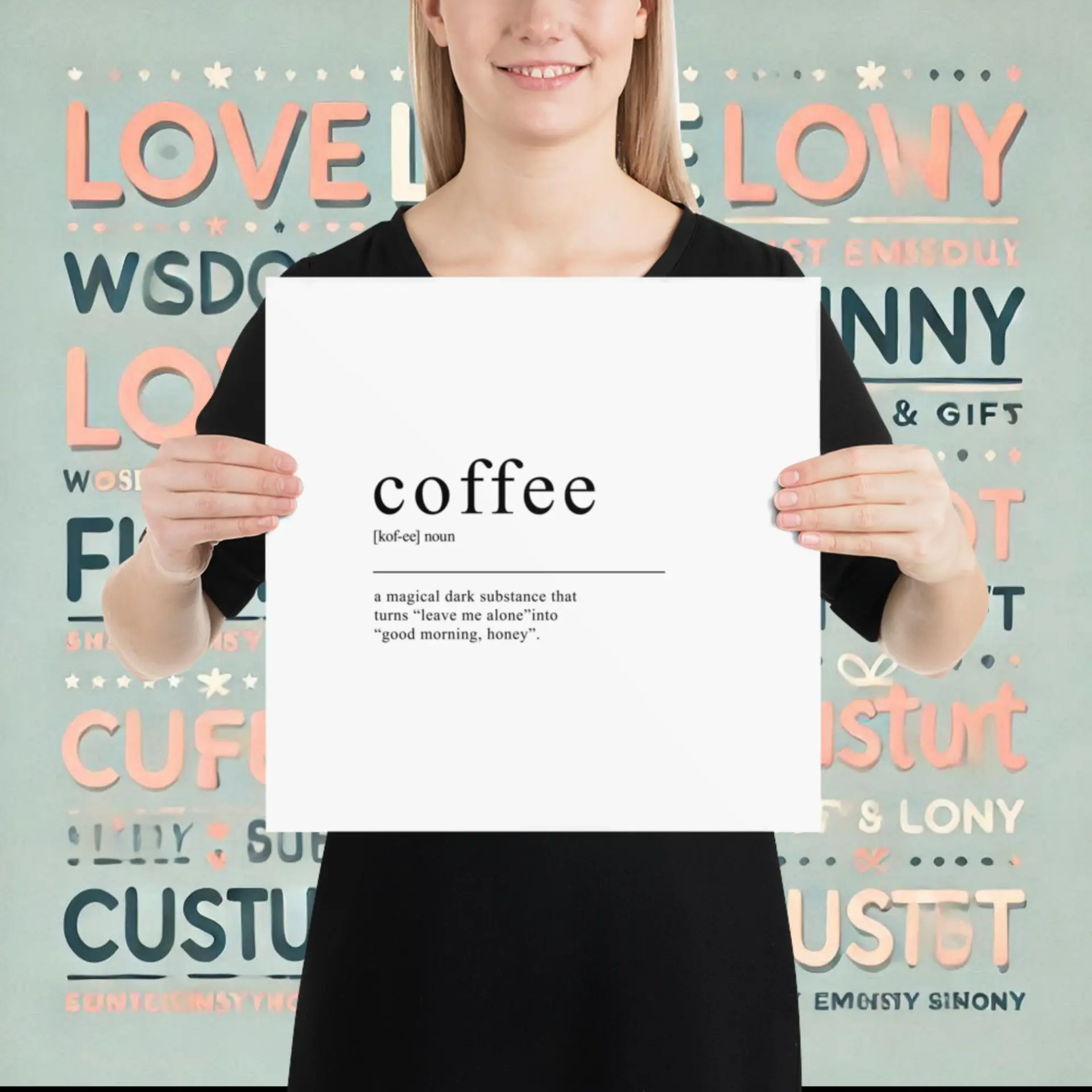The funny coffee typography poster (inch) brings bold caffeine energy to your wall. This sleek black text design on white matte paper makes the perfect statement for coffee lovers. Choose your size and place your order today. Frame it for a refined look or keep it unframed for modern flair.