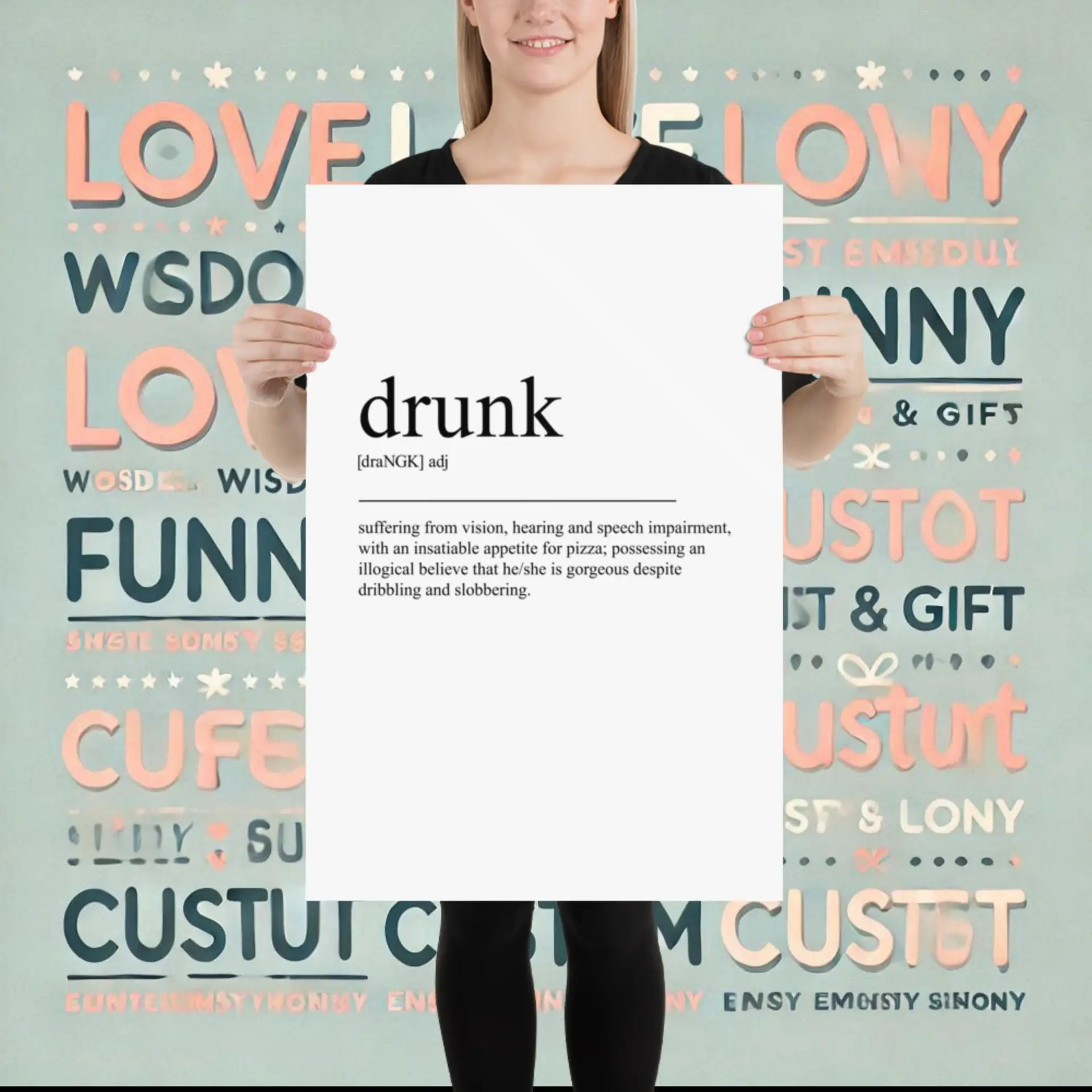 Bring laughter into your space with the Drunk typography definition poster (inch). Printed on premium matte paper, this poster delivers both quality and personality. Add it to your cart now. Gift it to friends, roommates, or keep it as your own conversation starter.