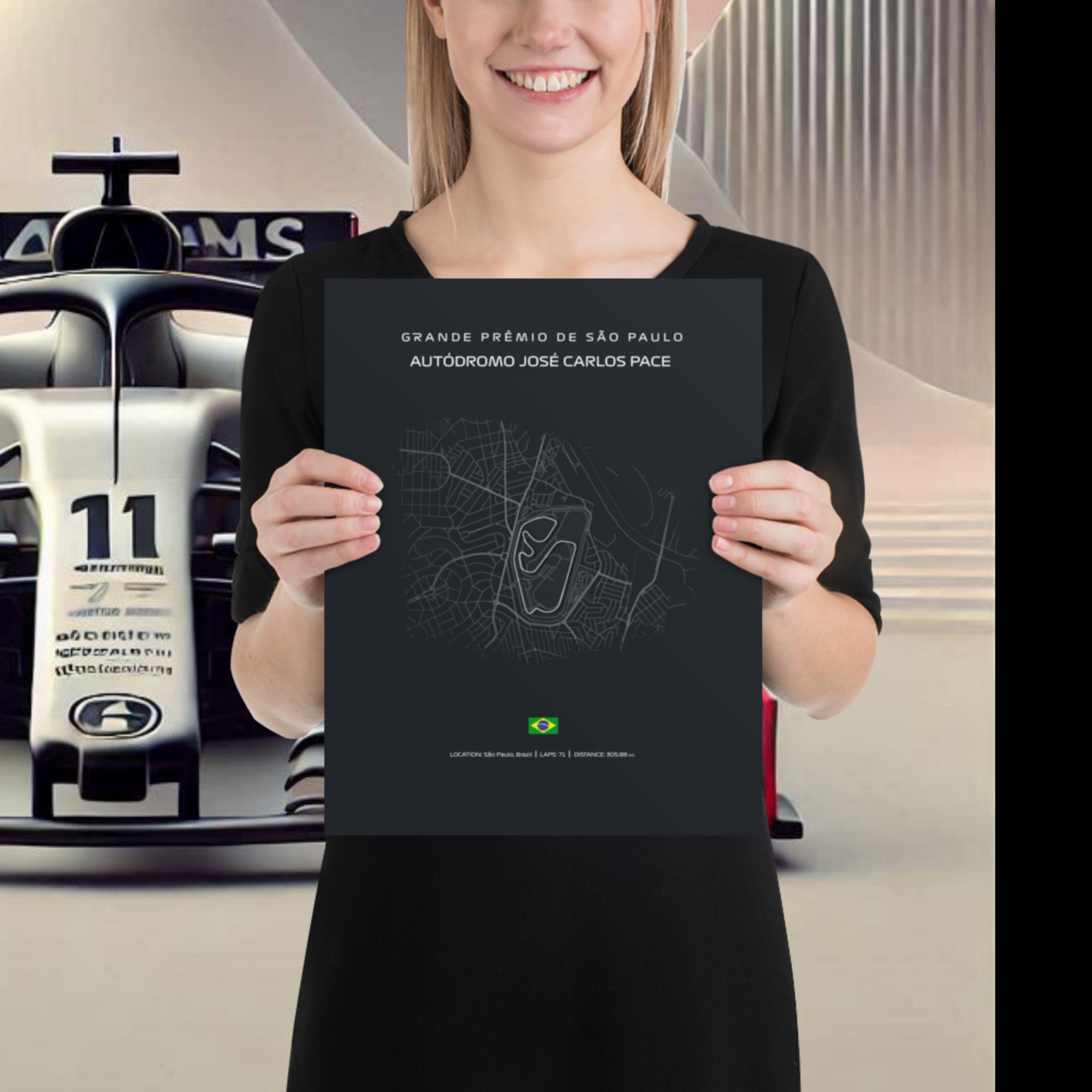 The F1 Brasil Circuit poster (inch) celebrates the thrilling spirit of the Brazilian Grand Prix. This bold black layout on premium white matte paper features the famous Interlagos track. Choose your ideal size and place your order today. Frame it for a sleek, modern finish or hang it unframed for minimalist flair.