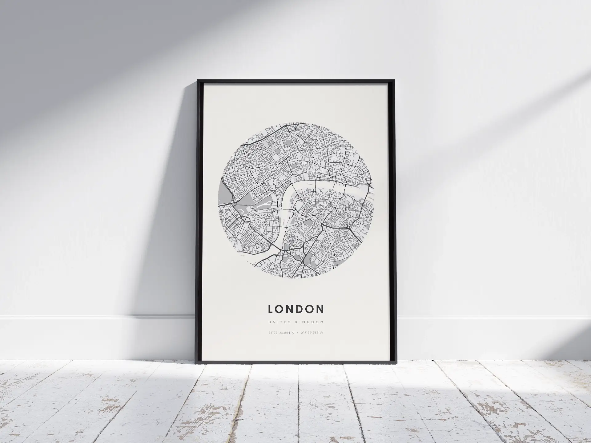 Bring the timeless elegance and urban energy of England’s capital to your walls with this Frameless London Citymap Poster (cm). Designed in a modern circular layout with detailed street mapping, this minimalist black and white print beautifully captures the iconic structure of London — from Westminster and Soho to the Thames and beyond.