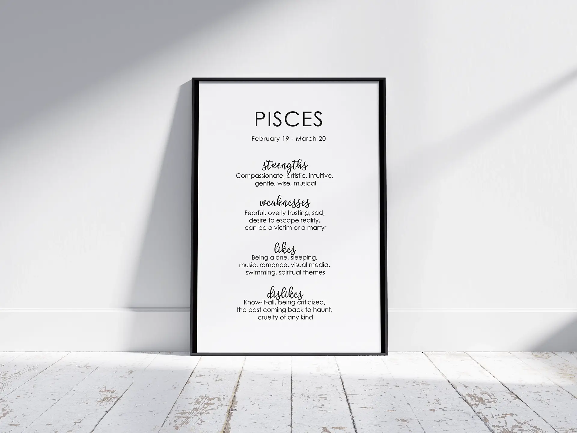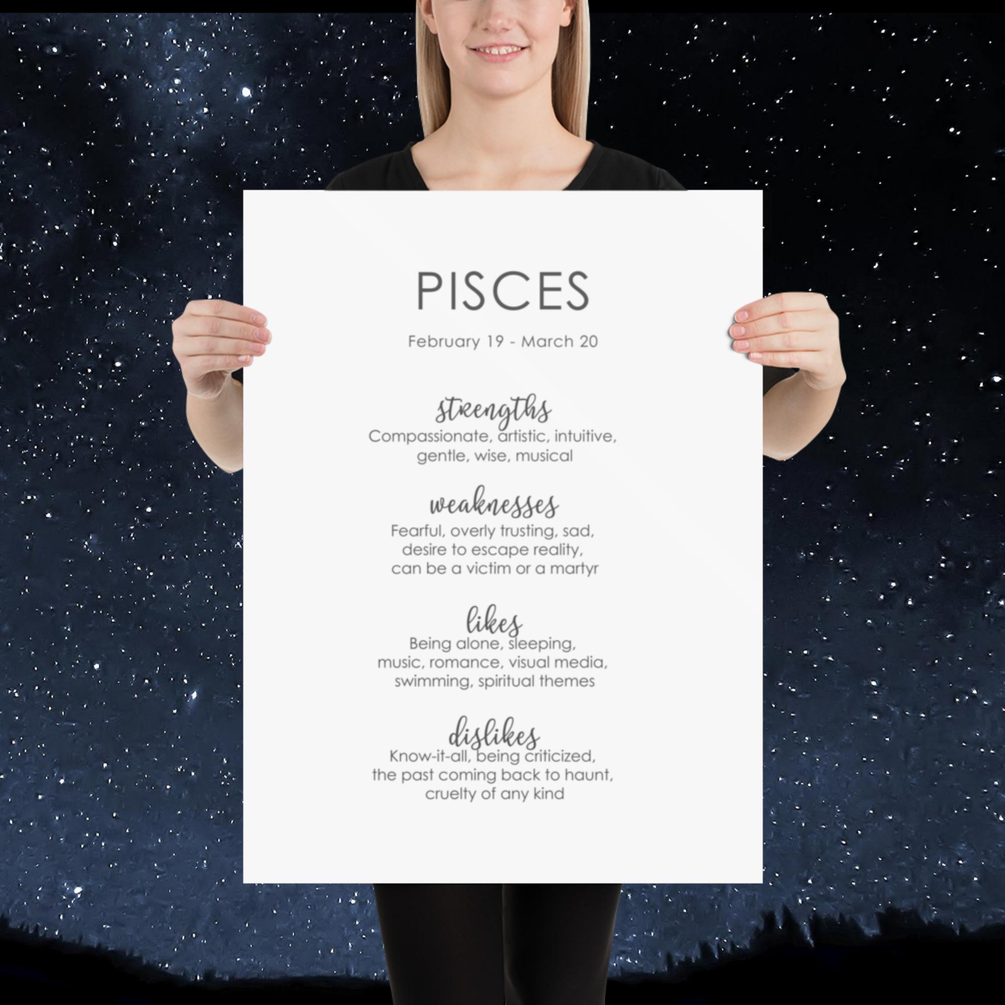 The Pisces traits poster (inch) celebrates the intuitive, empathetic, and dreamy energy of the Pisces zodiac sign. Those born between February 19 and March 20 are known for their emotional depth, creativity, and compassion. This minimalist design captures the essence of Pisces with clean typography and modern simplicity—perfect for those who feel deeply and imagine freely.
