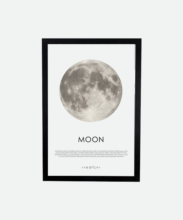 The Planet Moon poster (inch) celebrates Earth’s natural satellite with quiet elegance. The Moon has long symbolized intuition, emotion, and reflection. This minimalist design captures its rounded calm and mystery in a clean, black-and-white silhouette.