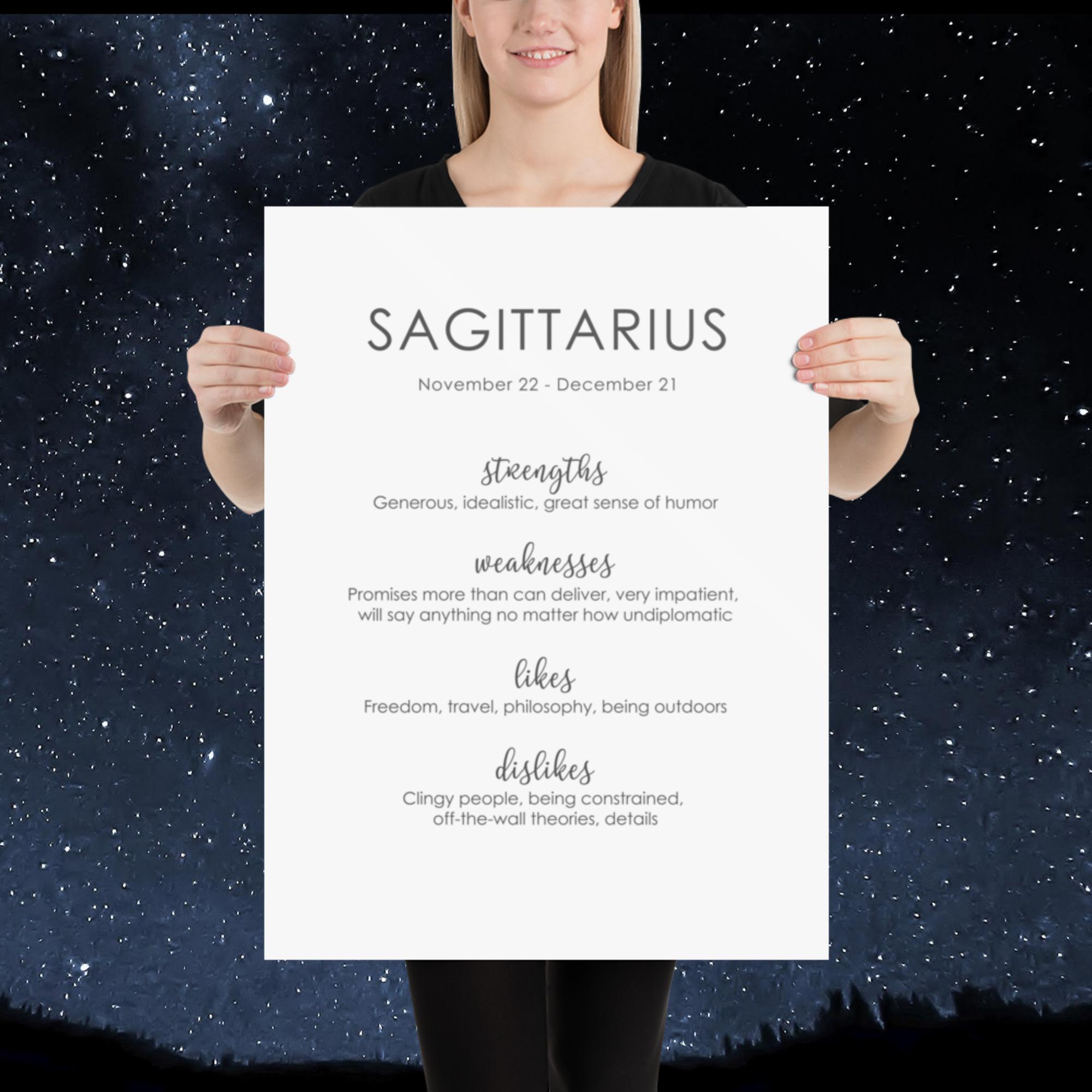 Printed on premium matte paper, the Sagittarius traits poster (inch) is a thoughtful gift or personal statement. It blends astrology with sleek design, making it perfect for modern homes filled with energy, ideas, and dreams.
