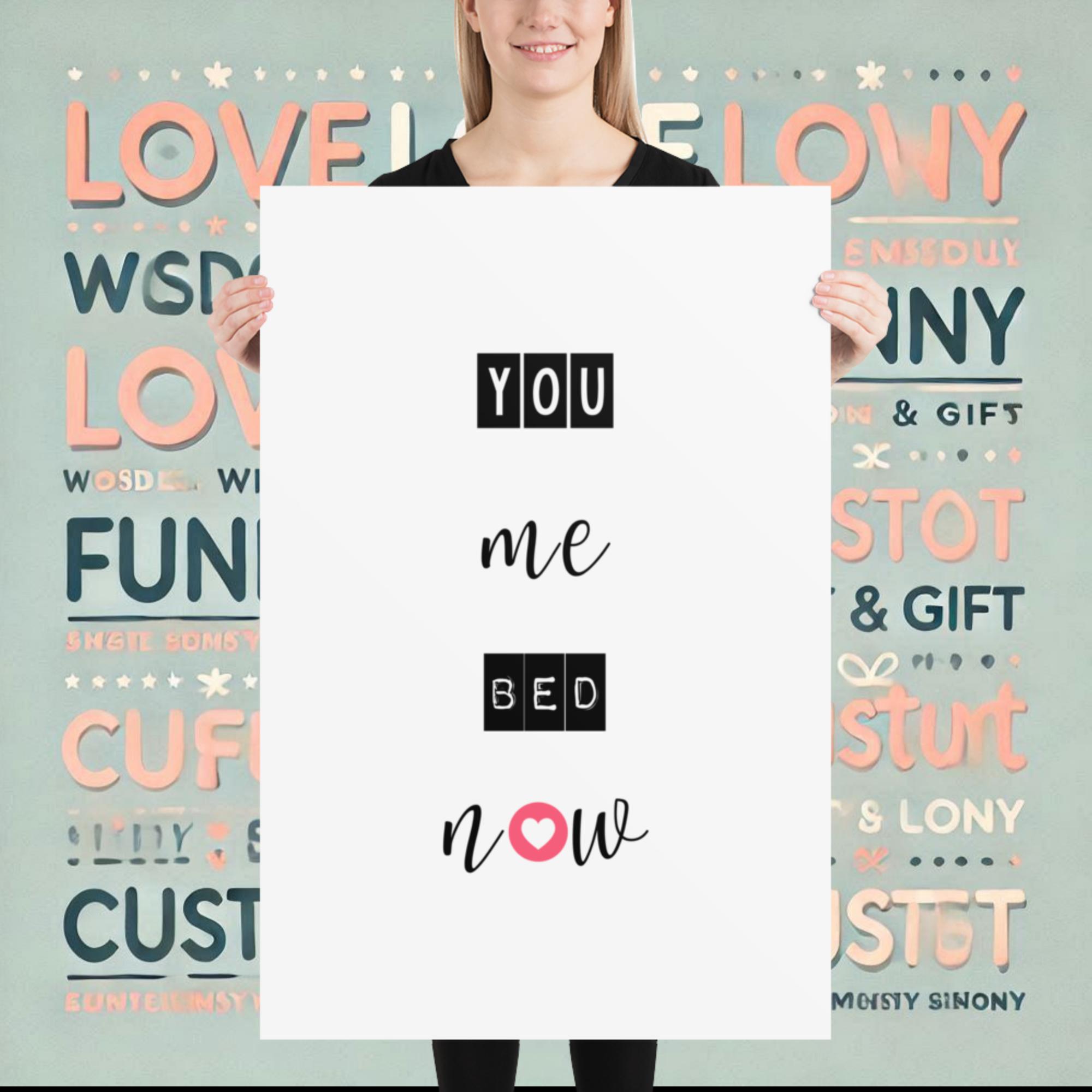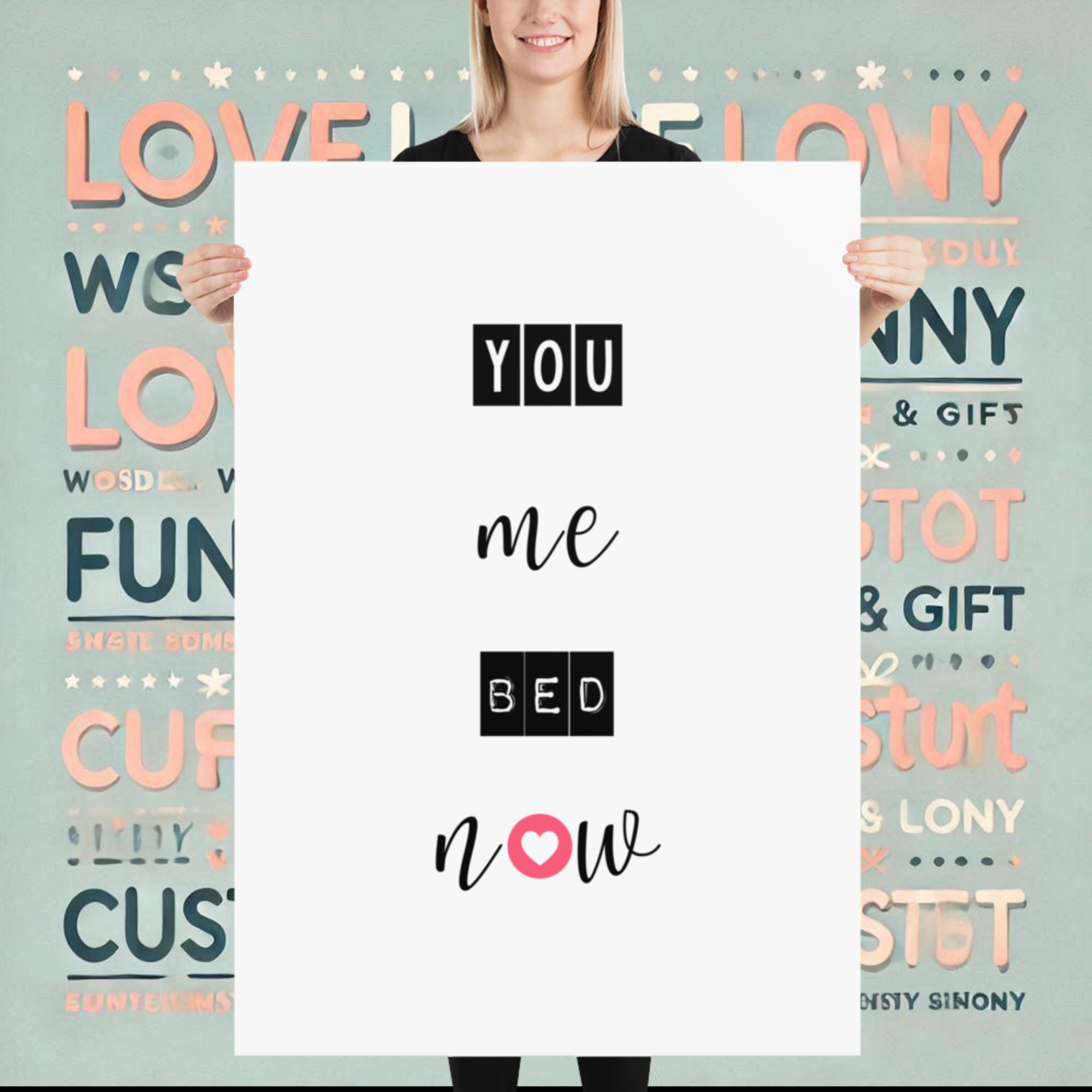 Printed on premium matte paper, the You Me Bed Now poster (cm) is perfect for bedrooms, apartments, or as a fun gift for couples who love a little edge with their design.